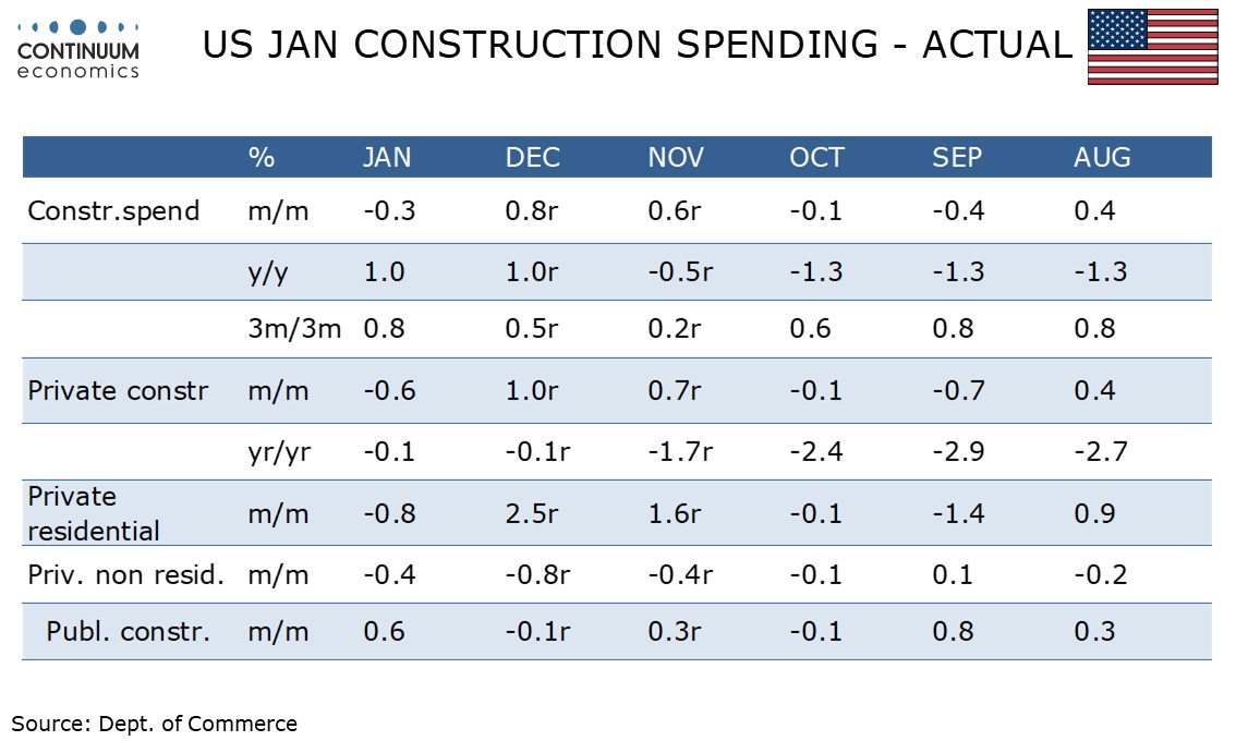 January data showed private residential investment correcting from Q4 strength but this may be in part on weather. Private non-residential spending remains weak while public spending bounced after a marginal decline in December.