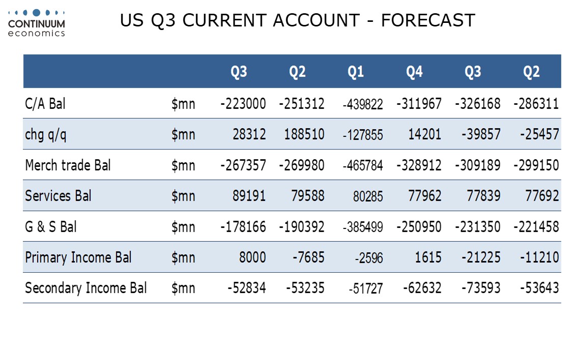 Still to be released are data on primary (investment) income and secondary (unilateral transfers) income. Fed flow of funds data however suggests the firmer will produce a surplus of around $8.0bn, after a deficit of $7.7bn in Q2. The latter looks set to see only a marginal narrowing of the deficit, to $52.8bn from $53.2bn in Q2.