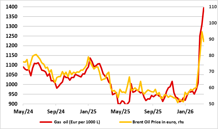 The first of the Iran War induced rise in prices arrive in the coming week with flash March HICP data. We see the headline rate spiking higher to 2.6%-2.7 from February’s 1.9%, the former largely chiming with that implied ECB thinking from the latter’s recent updated projections. But both it and ourselves see the core rate falling back in March regardless as this March surge will be purely energy-led. But with us seeing more real economy damage which together with tight(er) financial conditions we do not see the HICP rising as much as the ECB envisages beyond this quarter, albeit we do concur that the headline may be back below target by mid-2027. Thus we see the peak in HICP inflation just under 3% around mid-year. We accept risks – but on both sides but with those on the upside for inflation being possible price gouging (ie over-charging) given the manner in which the likes of heating oil prices have soared!