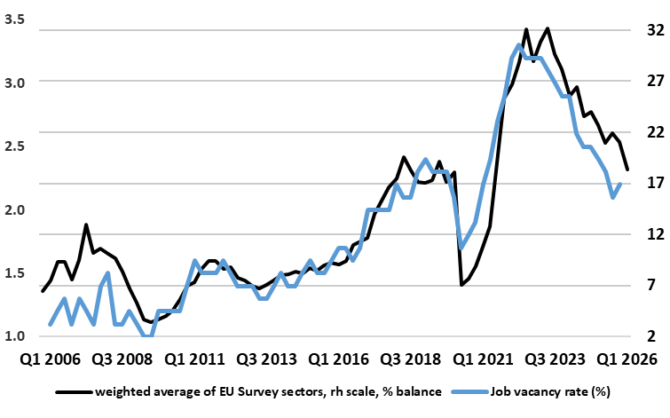 Diehard hawks at the ECB remain focused on the recent rise, and seemingly more apparent resilience, in services inflation and now can allow the energy price surge to perturb them further. Of course, the ECB is still reverberating from the energy-induced surge in inflation that ensued from the pandemic and then the Ukraine War and the criticism levied at it about being slow to react. But perspective is needed as it is important to stress that the EZ economy is better positioned to absorb shocks, with the current situation very different from that of 2022 and the Ukraine War in which in losing access to Russian gas was a ‘shock’ super-imposed on an EZ economy where demand was recovering from the pandemic the latter having caused clear shortages. Job vacancy rates are now also much lower than the record highs then s are perceived labor shortages (Figure 2). Moreover, the monetary setting is vastly different now, with policy rates very positive and inflation much lower so that real rates are effectively well over 6 ppt higher than four years ago.
