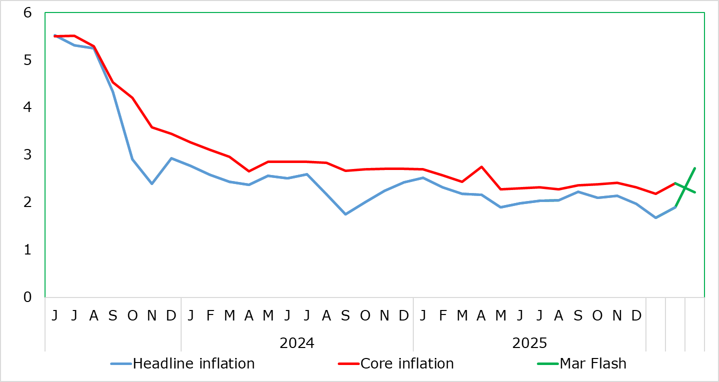 Having dropped to 1.7% in the January data, thereby matching expectations and the short-lived Sep 24 outcome, the headline HICP rate rose 0.2 ppt to 1.9% in February only partly due to energy. Even more unexpectedly, the core rose similarly to a 3-mth high of 2.4%. That reflected a fresh rise in services inflation and less weak non-energy goods prices, the former though linked to the Olympics and should reverse in March data – hence the anticipate drop in the core for this month.