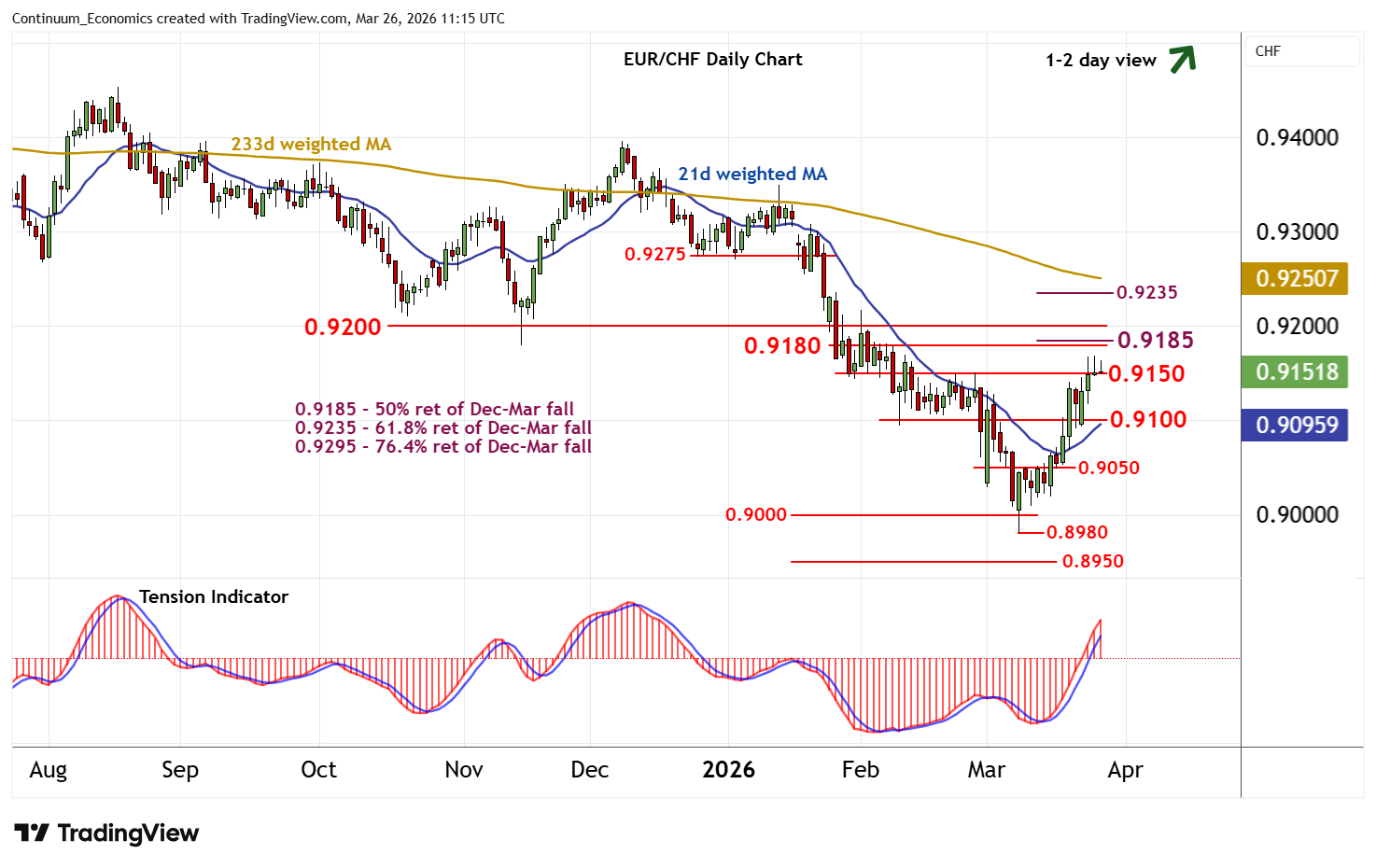 10:55 GMT - Little change, as prices extend consolidation above 0.9150. Daily readings are improving and broader weekly charts are rising, highlighting room for continuation of March gains towards strong resistance at congestion around 0.9180 and the 0.9180 Fibonacci retracement. However, already overbought daily stochastics could limit any initial tests of here in consolidation, before prices extend still further. Meanwhile, support remains at 0.9150. A close back beneath here, if seen, will help to stabilise price action and prompt fresh consolidation above 0.9100.