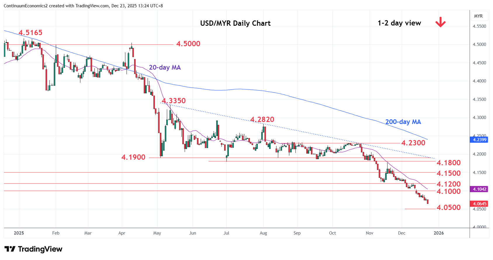 05:30 GMT - Still slipping as prices extend sharp losses from the 4.2300 October high to reach fresh year low at 4.0650. Pressure remains on the downside and lower will see room to the 4.0500 congestion. Lower still, if seen, will see room for extension to support at 4.0280 then 4.0000, January 2021 year low. Deep oversold daily studies caution corrective bounce with resistance starting at the 4.0800/4.1000 congestion and 2024 year low. Would need lift over these to ease the downside pressure and open up room for corrective bounce to retrace losses from the 4.2300, October high.