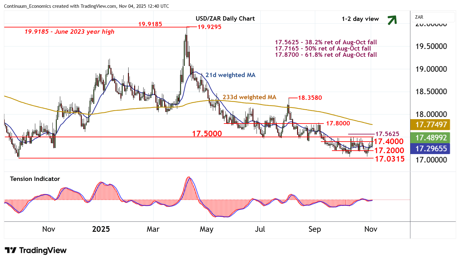 12:10 GMT - Choppy trade is giving way to a move higher, as intraday studies rise, with prices currently trading within the 17.4000 - 17.5000 resistance. Daily readings have turned higher and broader weekly charts are improving, highlighting room for further strength in the coming sessions. However, a close above the 17.5625 Fibonacci retracement is needed to turn sentiment positive and extend October gains towards 17.8000. Meanwhile, support remains at congestion around 17.2000. But a close below the 17.0315 year low of 30 September 2024 would confirm a deeper correction of the broad 2021-2023 rally, as focus then turns to the 16.6900 monthly low of January 2023.