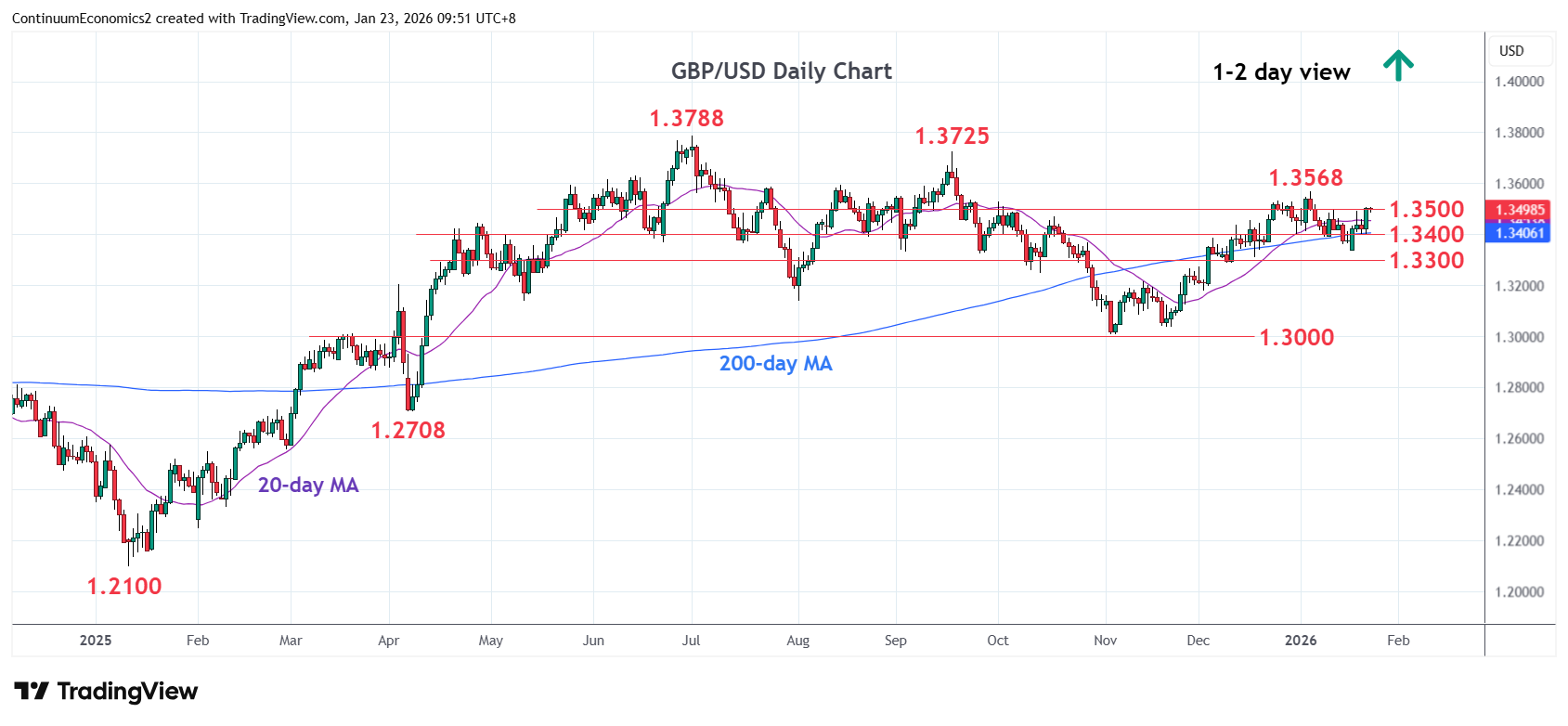 02:00 GMT - Turned up in consolidation from the 1.3400 support to retest resistance at the 1.3500 congestion. Positive daily studies keeps pressure on the upside and clearance here will open up room for retest of the 1.3568 high. Clearance here will extend the broader gains from the November low and see room for extension to the 1.3600/50 congestion. Beyond this will return focus to the 1.3725 and 1.3788, September and July 2025 year high. Meanwhile, support at 1.3400 level should underpin and sustain gains from the 1.3340 Monday's low.