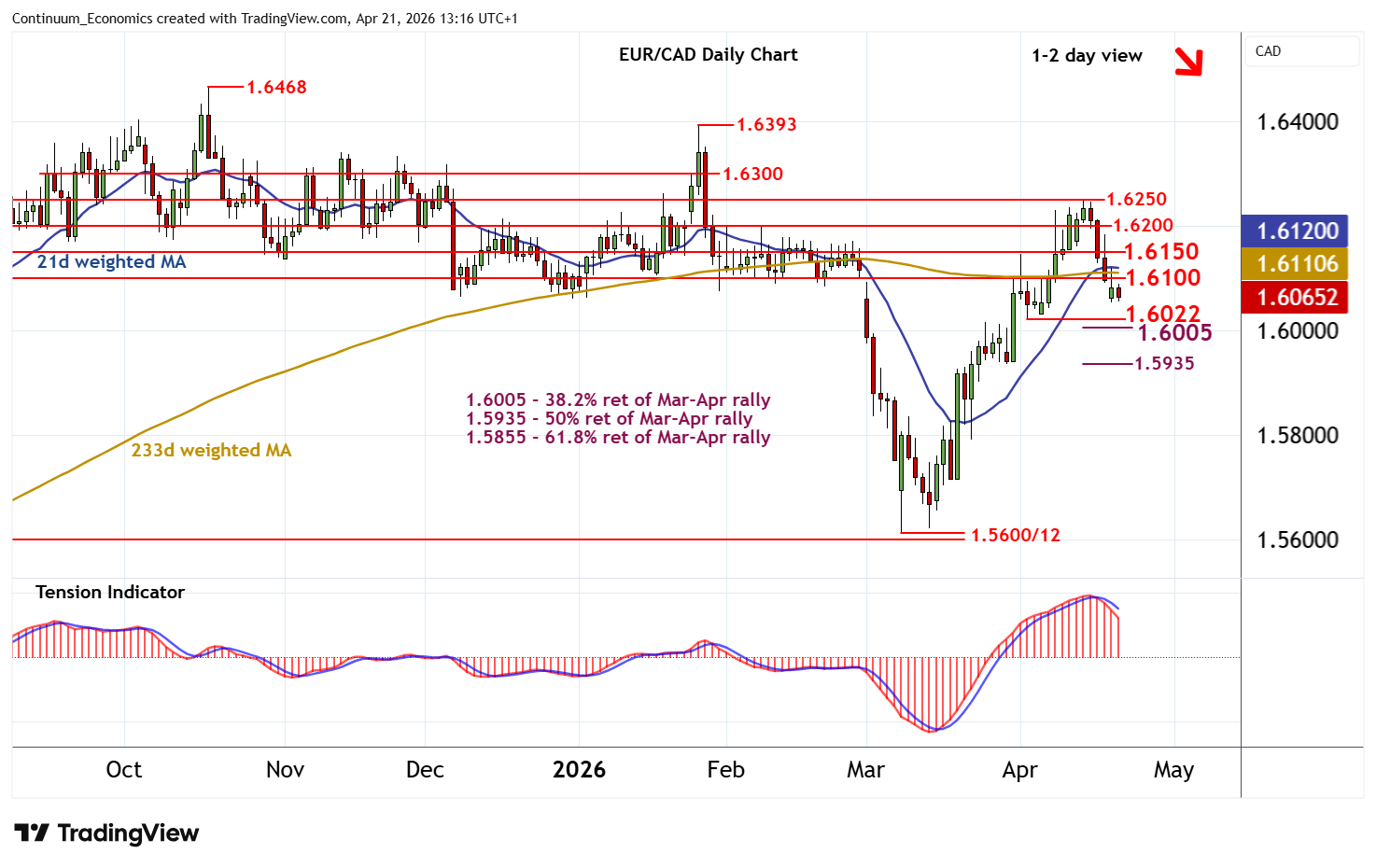 13:05 BST - Cautious trade around resistance at 1.6100 is giving way to a drift lower, with prices currently balanced around 1.6070. Daily readings are under pressure and overbought weekly stochastics are flattening, highlighting room for further losses in the coming sessions. A break below the 1.6055~ low of 20 April will open up strong support within the 1.6000/05 - 1.6022/25 range. But already oversold daily stochastics and the rising weekly Tension Indicator should limit any initial tests in consolidation. Meanwhile, a close back above 1.6100 will help to stabilise price action and prompt consolidation beneath congestion around 1.6150.