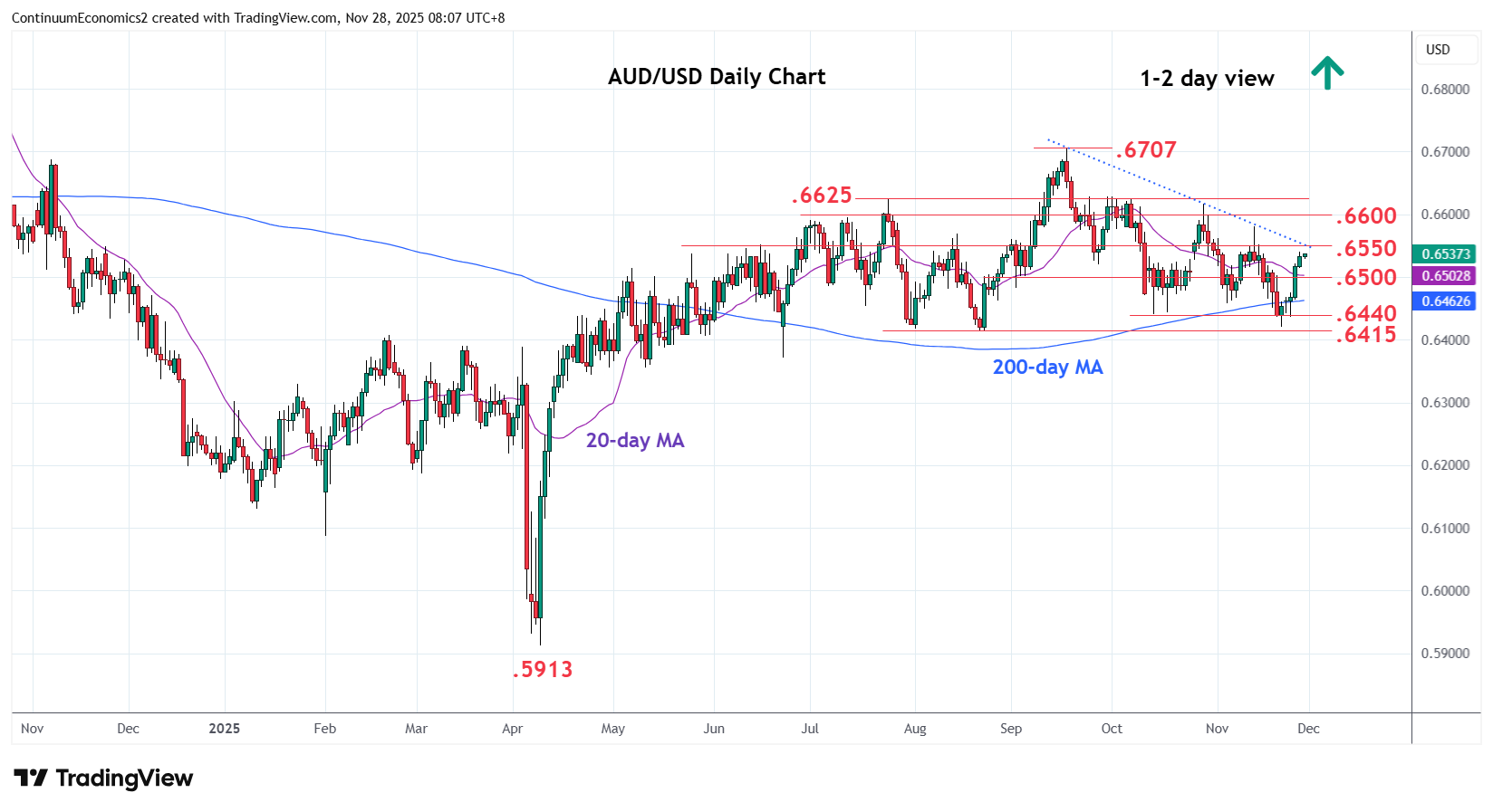 00:10 GMT - Break above resistance at the .6500/20 area seeing gains to approach the .6550 resistance and trendline from the September high. Both daily and weekly studies continues to track higher from oversold areas and suggest scope for break here to extend bounce from the low of last week. Higher will see room for extension to strong resistance zone at the .6600 level and .6625/30, July/October highs. Meanwhile, support at the .6500 level should underpin and sustain bounce from the .6440/.6415, October/August lows.