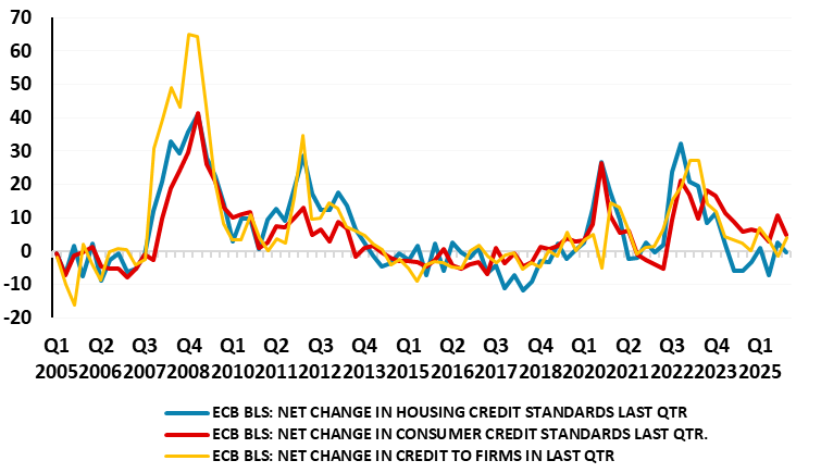 Unsurprisingly, with banks both partly warier and partly more unwilling to lend, it is not surprising that actual loan growth rates have started to slow. Indeed, this is very much the case for lending to firms where Figure 3 illustrates the logical and historical inverse relationship. The question is whether this slower loan growth is either/both supply or demand driven. In this regard, it seems that this is even more tangible evidence that the joint-threat posed by U.S. tariffs and global uncertainty is therefore becoming more of a reality rather than having diminished as is perhaps the central feature of what seems to be the latest ECB thinking – ie global risks and tensions have diminished.