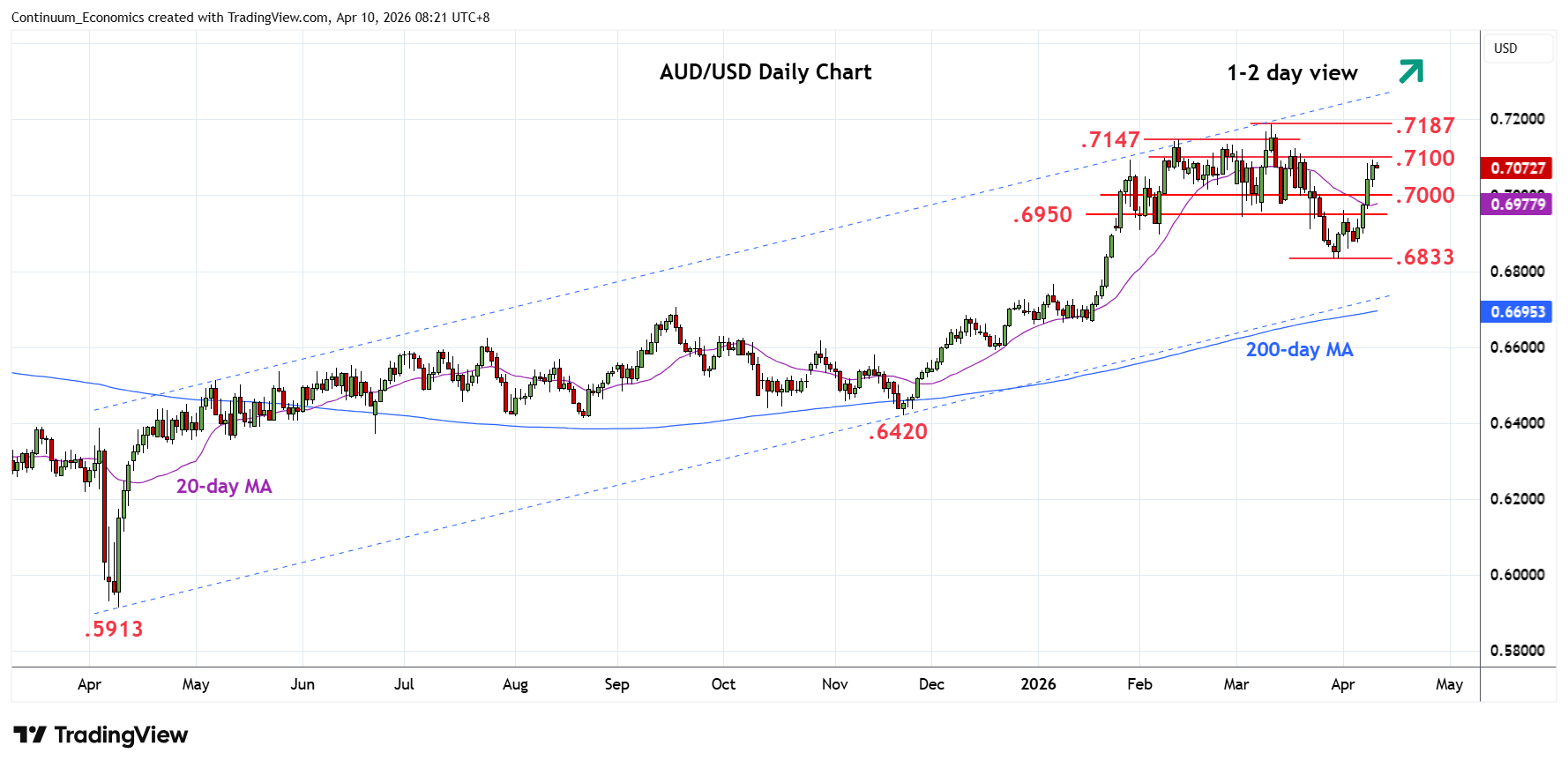 00:20 GMT - Gains just shy of the .7100 level but pressure remains on the upside and see scope for break here to open up room for retest of the February high at .7147. Beyond this will expose the .7187 March current year high to retest. Would expect reaction on retest here but a later break cannot be ruled out to extend the broader gains from the April 2025 year low. Meanwhile, support remains at the .7000 figure which should underpin and sustain gains from the .6833 March swing low.