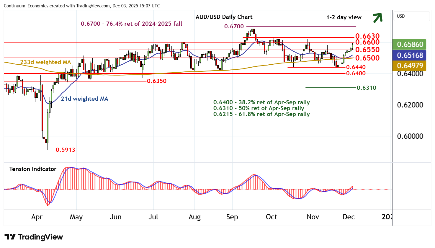 14:45 GMT - The break above 0.6550 is meeting selling interest just beneath congestion resistance at 0.6600, as positive intraday studies flatten, with prices currently trading around 0.6585. The rising daily Tension Indicator highlights room for a break above here. But flat overbought daily stochastics are expected to limit initial scope in consolidation beneath the 0.6630 break level, before improving weekly charts extend gains towards critical resistance at 0.6700/05. Meanwhile, support is at congestion around 0.6550. A close beneath here would stabilise price action and prompt fresh consolidation above further congestion around 0.6500.
