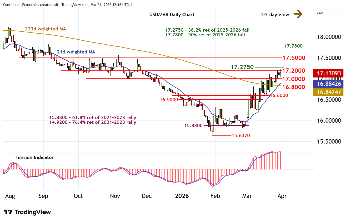 11:50 BST - Still little change, as the flat daily Tension Indicator and a tick lower in daily stochastics keep sentiment cautious and prompts further choppy trade beneath resistance at the 17.2000 congestion highs and the 17.2750 Fibonacci retracement. Overbought weekly stochastics are also flattening, suggesting room for a minor pullback. But the rising weekly Tension Indicator should limit any tests below congestion support at 17.0000 in renewed buying interest towards further congestion around 16.8000. Following cautious/corrective trade, fresh gains are looked for. But a close above 17.2750 is needed to improve sentiment and extend late-January gains towards resistance at the 17.5000 break level.