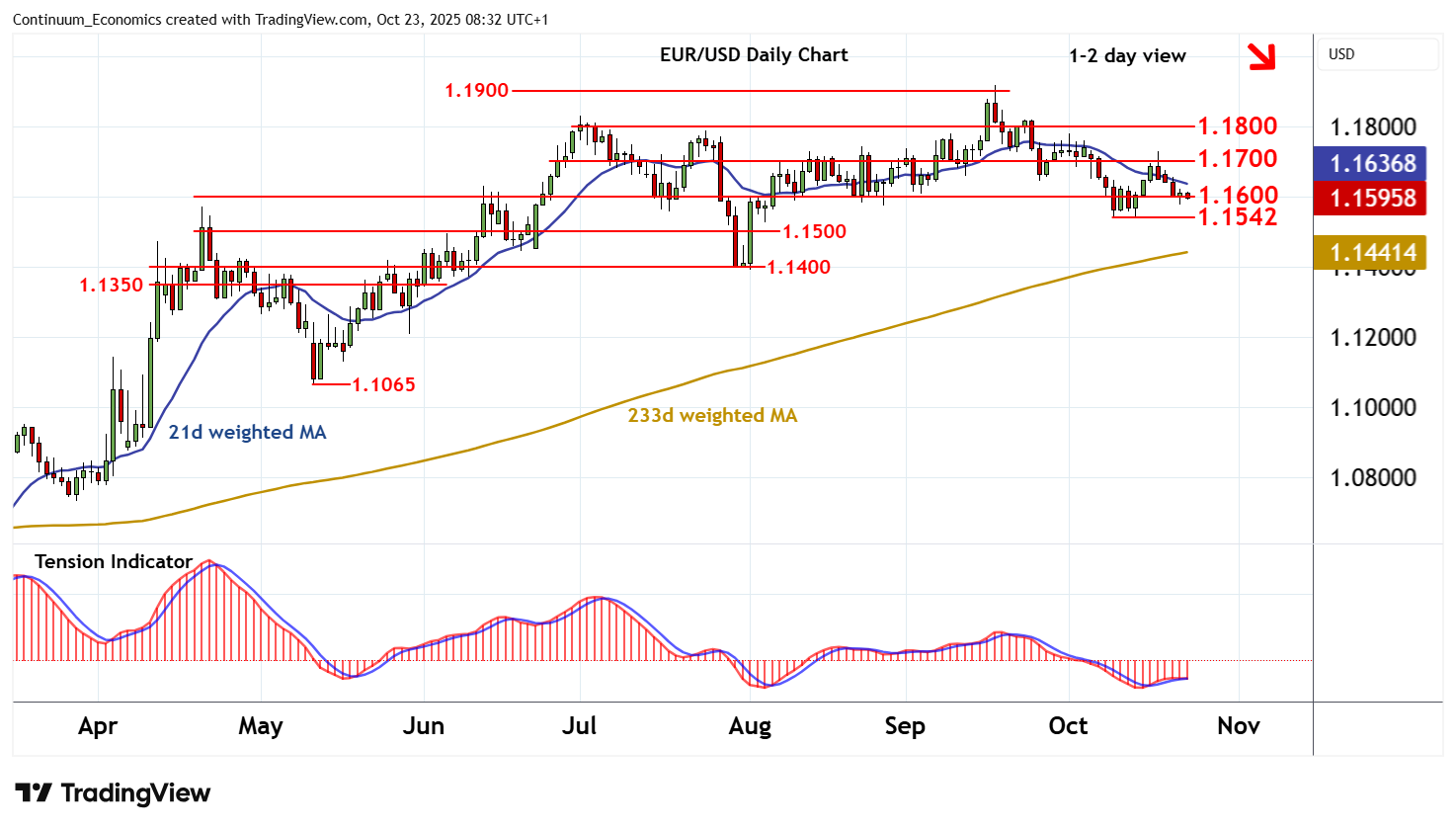 08:30 BST - Little change, as prices extend cautious trade around congestion support at 1.1600. Daily readings are deteriorating and broader weekly charts are under pressure, highlighting room for further losses in the coming sessions. A break will open up stronger support at the 1.1542 weekly low of 9 October. A further close beneath here will add weight to sentiment and extend mid-September losses initially to congestion around 1.1500. Meanwhile, resistance remains at congestion around 1.1700 and extends to the 1.1728 weekly high of 17 October. A close above here is needed, not yet seen, to improve sentiment and extend October gains towards congestion around 1.1800.