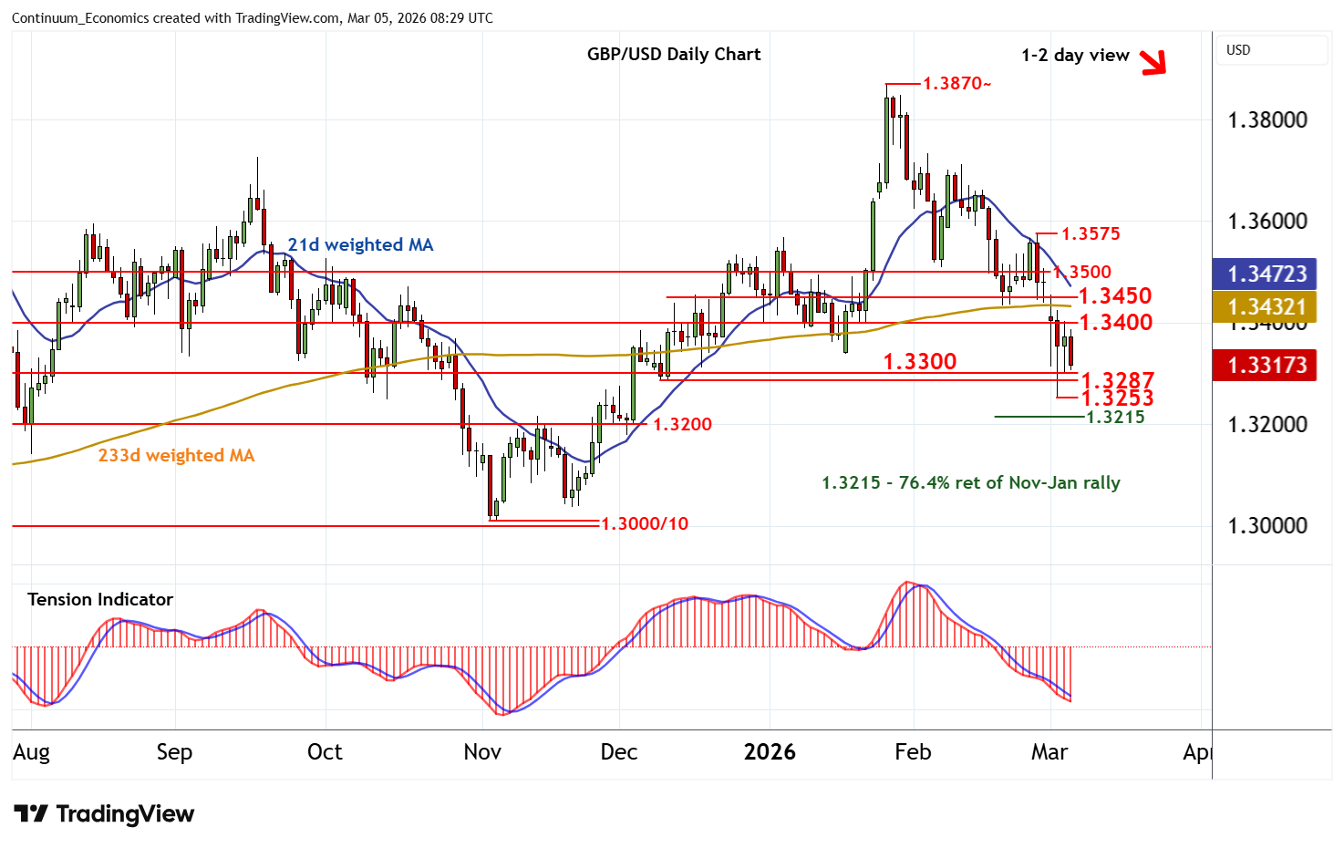 08:10 GMT - The anticipated minor test higher has met selling interest at congestion resistance around 1.3400, with prices settling lower towards support at the 1.3287 weekly low of 9 December and congestion around 1.3300. Intraday studies are falling, and both daily and weekly readings are negative, highlighting room for deeper losses in the coming sessions. A close below 1.3287/00 will open up the 1.3253 current year low of 3 March, with further selling adding weight to sentiment and extending late-January losses towards congestion around 1.3200 and the 1.3215 Fibonacci retracement. Already oversold daily stochastics could limit any initial tests of this range in short-covering/consolidation. Meanwhile, any immediate tests higher should meet renewed selling interest beneath 1.3400.