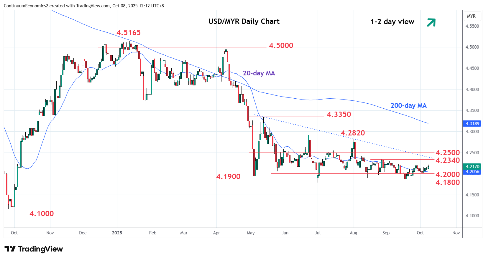 04:15 GMT - Edging higher in consolidation above the 4.2000 support with bounce setting up scope for retest of 4.2240, 26 September high. Break here will open up room for stronger gains to retrace the August/September losses to resistance at the 4.2340/4.2400 area. Higher still, will see extension to the 4.2500/4.2600 congestion area. Meanwhile, support at the 4.2000 congestion is expected to underpin. Only below this will expose the 4.1900/4.1800 lows to retest and threaten deeper pullback to retrace the 2024/2025 rally.