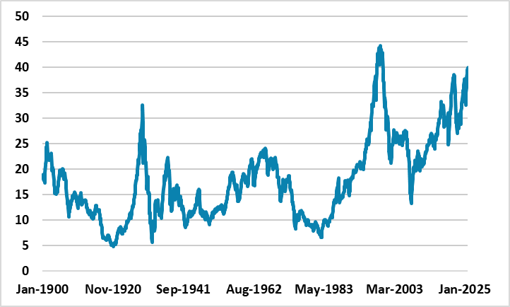 Figure 2: S&P500 CAPE Shiller P/E Pushing Back Towards 2000 Peak