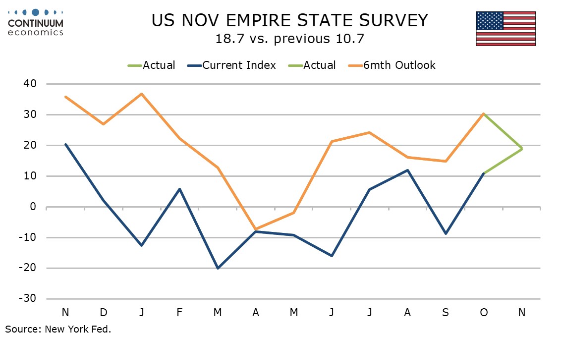 November’s Empire State manufacturing index at a positive 18.7 from 10.7 is the strongest in twelve months, and the third healthy number in four months, though with November 2024 strength at 20.7 not having persisted we would treat the latest strength with a degree of caution.