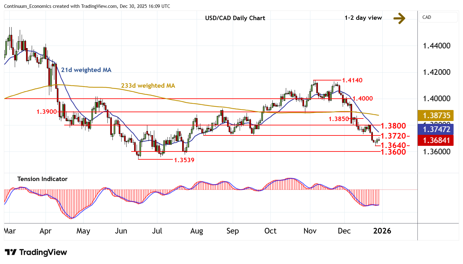 15:45 GMT - Cautious trade has given way to a minor drift higher, with prices currently trading around 1.3700. Oversold daily stochastics are rising and the bearish daily Tension Indicator is flattening, suggesting potential for a test above here towards resistance at the 1.3720~ lows from August-September. However, mixed/negative weekly readings are expected to limit any tests in consolidation. A close above here, if seen, would help to further stabilise price action and prompt consolidation beneath congestion around 1.3800. Meanwhile, support remains at the 1.3640 weekly low of 26 December. A close beneath here would turn sentiment negative and extend November losses initially towards congestion around 1.3600.