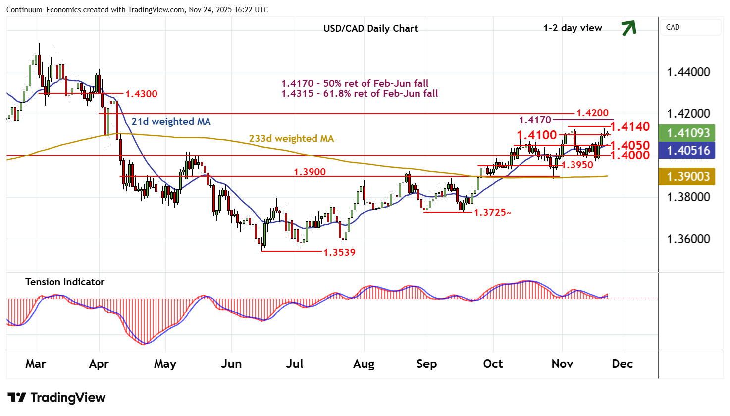 Still little change, as prices extend pressure on resistance within the 1.4100 break level and the 1.4140 weekly high of 5-6 November
