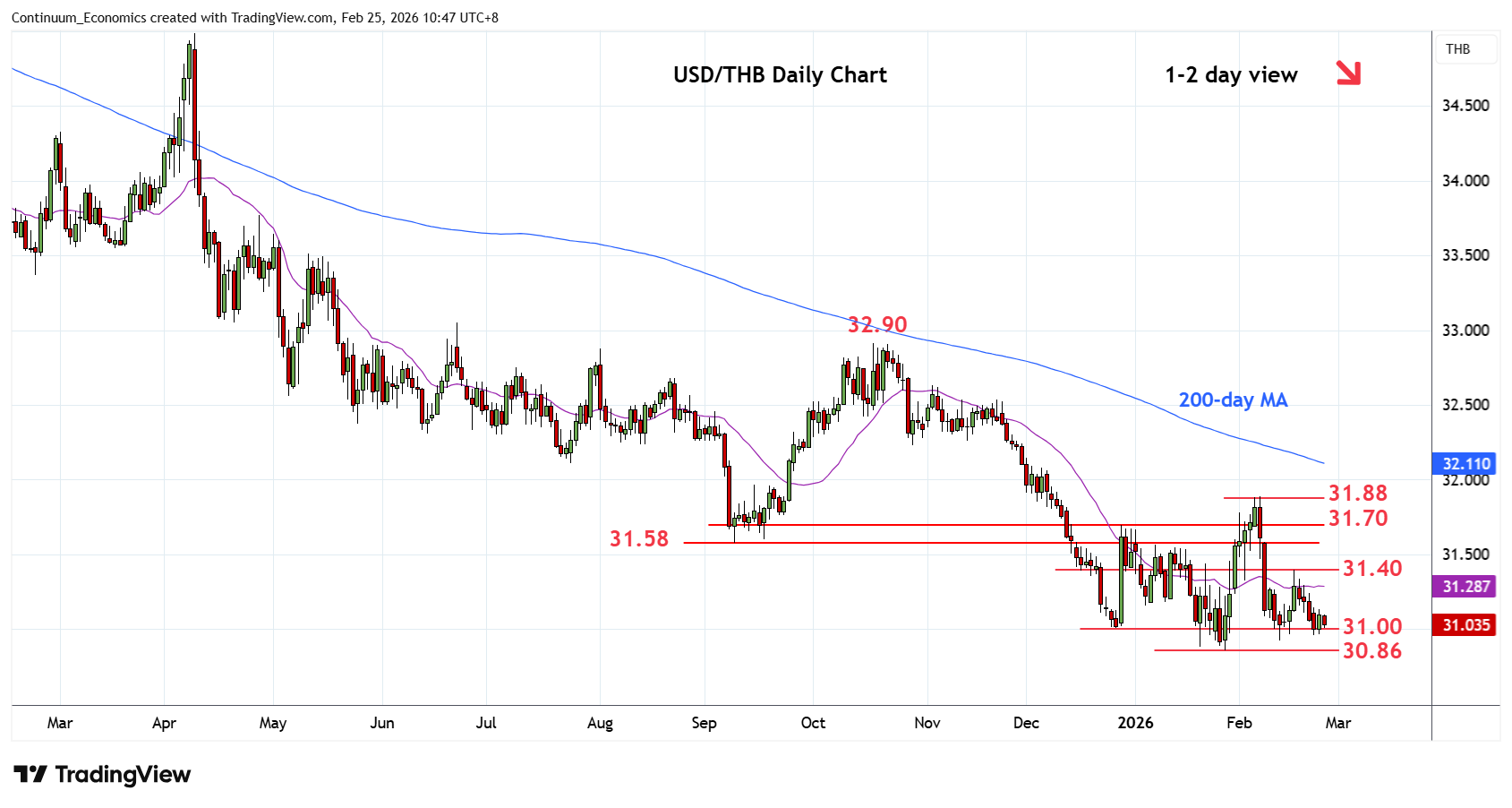02:50 GMT - Still little change, as prices extend consolidation above the 31.00 level. However, pressure remains on the downside and break here will expose the 28 January current year low at 30.86 to retest. Negative daily and weekly studies suggest scope for break here to further extend the broader losses from the October 2022 year high and see extension to the 30.80 congestion and the 30.65/30.50 area. Meanwhile, resistance at the 31.20/31.40 congestion area is expected to cap. Break here will ease the downside pressure and open up room for retest of the 31.58/31.70 resistance.