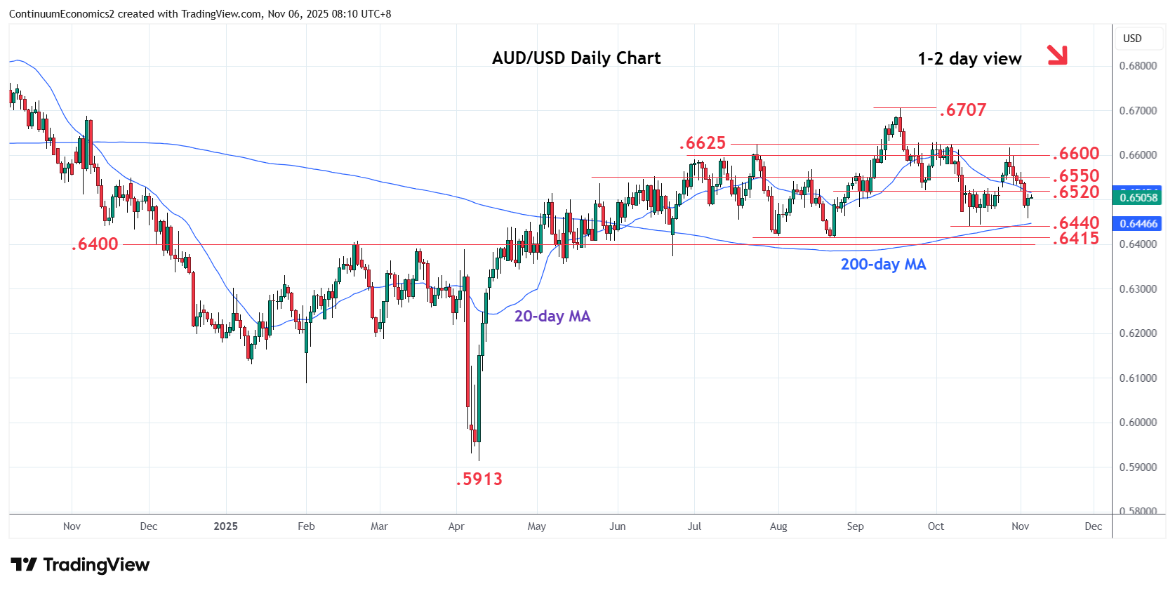 00:15 GMT - Turned up from the .6458 low to consolidate at the .6520/00 resistance as prices unwind oversold intraday studies. Above here will see room for strong corrective bounce but higher should see resistance at .6550 congestion capping and giving way to renewed selling pressure later. Below the .6458 low and .6440 support will turn focus to the critical .6415 August lows. Below this will see deeper pullback to retrace the April/September rally and see extension to the .6400/.6372 congestion and June low.