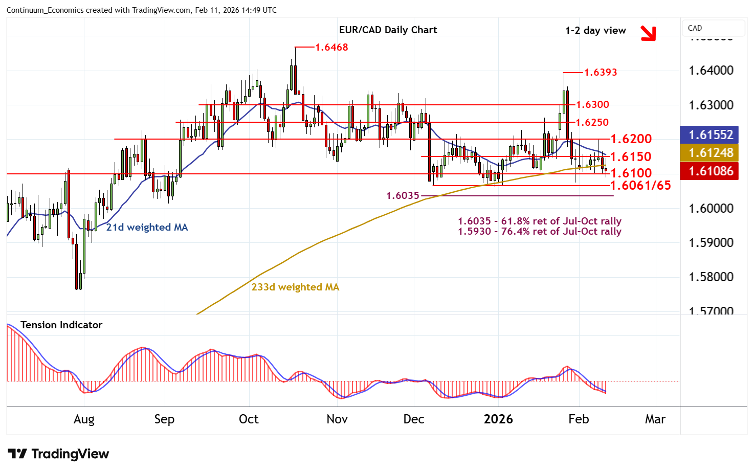 14:20 GMT - Little change, as prices extend cautious trade above congestion support at 1.6100. Daily readings are under pressure once again and broader weekly charts are negative, highlighting room for further losses in the coming sessions. However, a close below the 1.6061/65 monthly lows from 8-31 December is needed to turn sentiment negative and extend October losses initially to the 1.6035 Fibonacci retracement. Meanwhile, a close back above 1.6150, if seen, will help to stabilise price action and prompt consolidation beneath 1.6200.