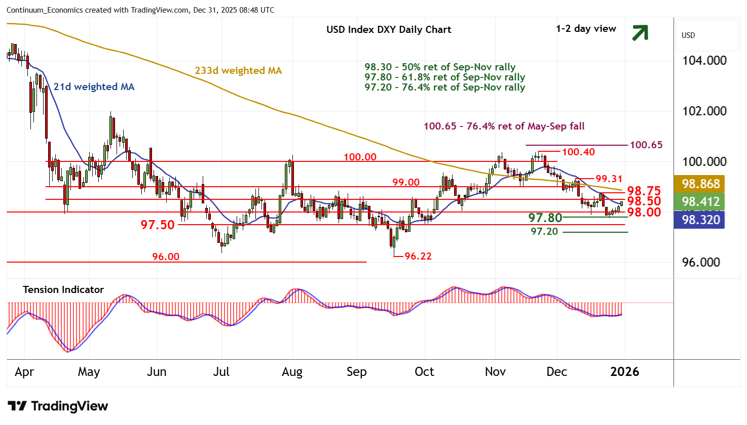 08:40 GMT - Cautious trade above congestion support at 98.00 is giving way to a drift higher, with focus turning to congestion resistance at 98.50. A tick higher in daily readings highlights room for a test above here. But negative weekly charts are expected to limit initial scope in renewed consolidation beneath the 98.75 weekly high of 19 December. A close above here, however, would improve sentiment and extend corrective gains towards further congestion around 99.00. Meanwhile, support remains at 98.00 and extends to the 97.80 Fibonacci retracement. This range should underpin any immediate setbacks.