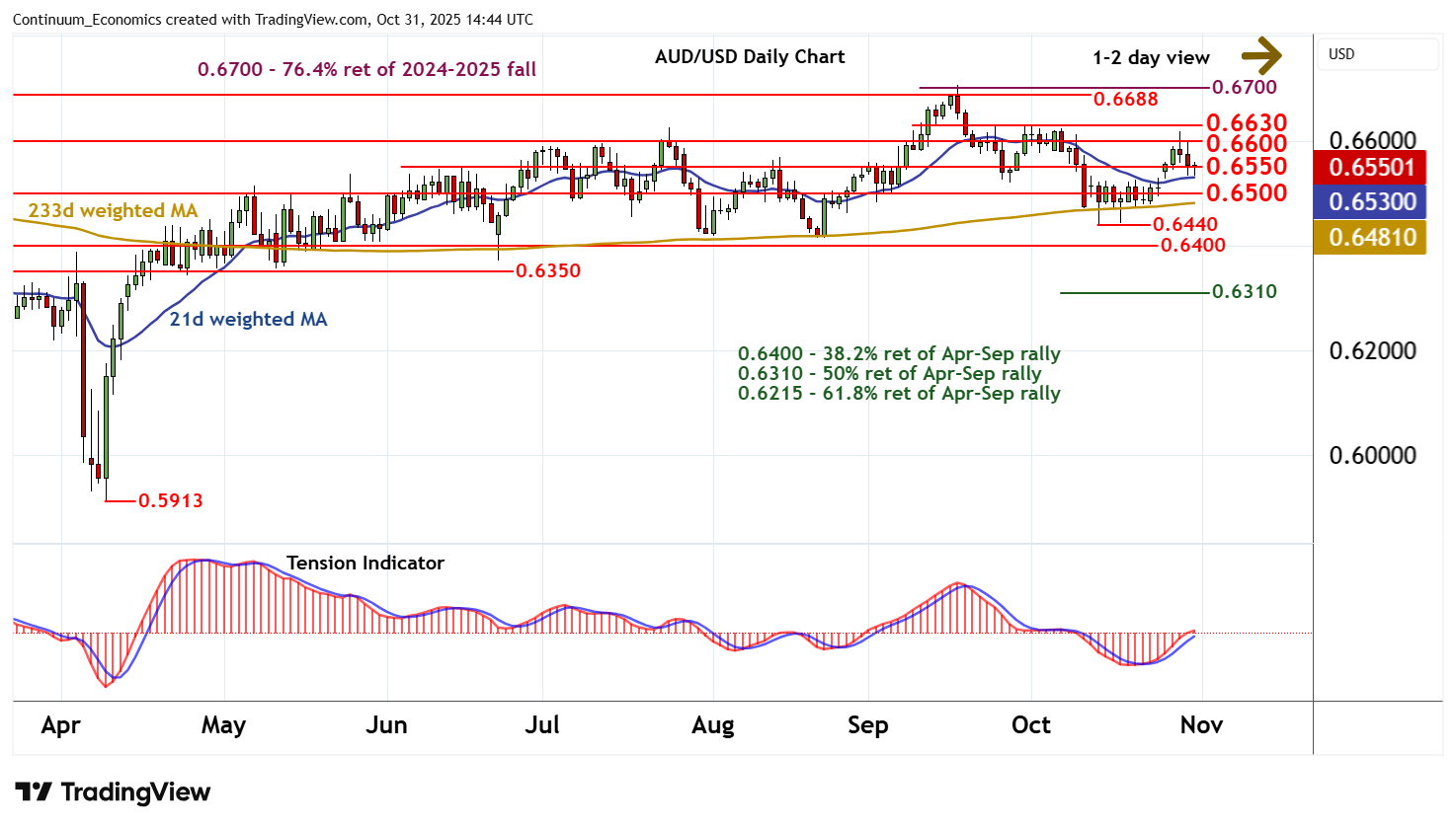 14:30 GMT - Little change, as prices extend choppy trade around congestion support at 0.6550. Overbought daily stochastics are turning down, highlighting room for a fresh test beneath here. But the rising daily Tension Indicator and mixed/positive weekly charts are expected to limit scope in renewed buying interest above further congestion around 0.6500. Meanwhile, resistance remains at congestion around 0.6600 and extends to 0.6630. A close above here is needed to turn sentiment positive and extend mid-October gains towards critical resistance at the 0.6688 monthly high of November 2024 and the 0.6700 Fibonacci retracement.