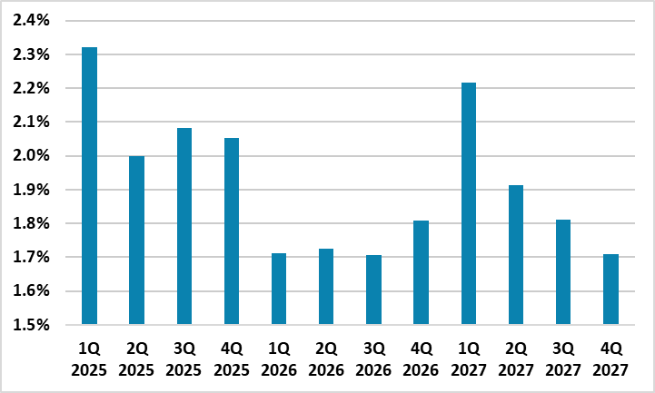 • Steady for now, but. Most on the ECB council appear to be comfortable with steady policy in 2026, after a cumulative 200bps of cuts. This will likely be the message from the December minutes on January 22 and at the February 5 ECB meeting. ECB Lane reemphasized this stance on January 16 and he is normally a good guide to policy. Though we look for a further two 25bps cuts in 2026, the economics are only partially in place. We have argued that financial conditions and lending are worse than the ECB depo rate would suggest, which reflects the extra refinancing costs for loans taken out between 2008-21 or return of investment calculations for new loans. Additionally, a wide set of economic indicators suggest the EZ economy is not really picking up, which the ECB should come round too. Thirdly, the ECB focus on compensation for workers is backward looking, with forward looking data (e.g. Indeed survey and wage tracker) suggesting wage inflation will be consistent with CPI inflation just below target (Figure 2). Finally, though defense and infrastructure spending will help Germany in 2026, other major EZ countries are fiscally restrained (see EZ Outlook here). Incoming economic data will build the case for further rate cuts, but it is unlikely to be in place for the March ECB meeting and so we have delayed our rate cut forecasts to 25bps in June and September. We also still see the ECB slowing the monthly pace of APP and PEPP QT by 25% in 2026, given the adverse impact on lending and financial conditions.