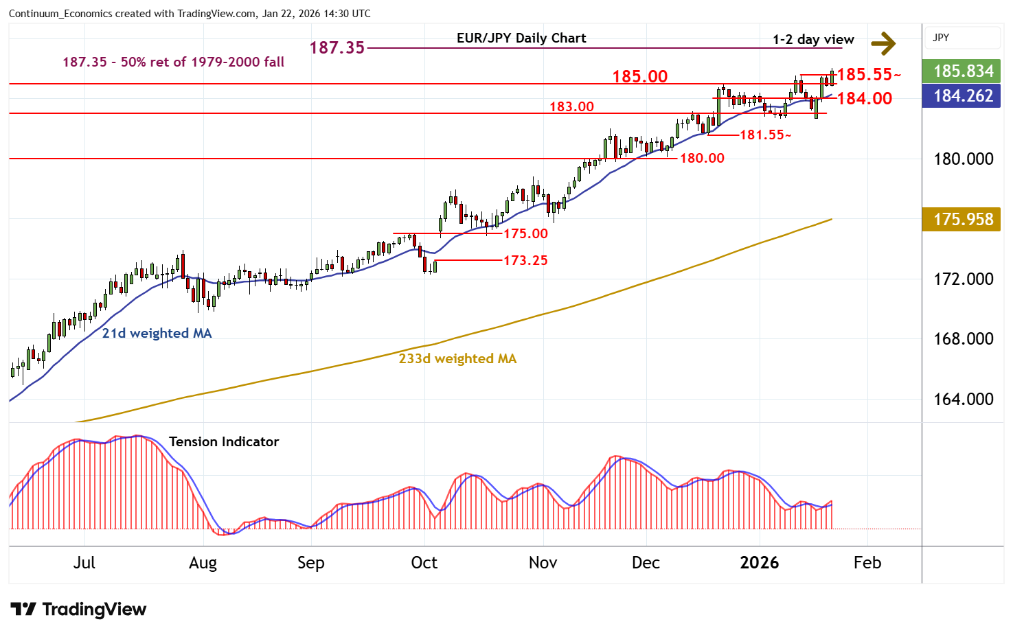 14:25 GMT - Cautious trade has given way to a break above the 185.55~ weekly high of 14 January in both EUR- and JPY-driven trade, with prices currently trading at fresh 2026 year highs around 185.80~. Daily readings have ticked higher, suggesting room for further strength in the coming sessions. But a close above 185.55~ is needed to turn sentiment positive extend long-term gains towards the 187.35 multi-decade Fibonacci retracement. Deteriorating weekly charts should limit any initial tests in profit-taking/consolidation. Meanwhile, support is raised to 185.00. A close beneath here, if seen, will help to stabilise price action and prompt consolidation above congestion around 184.00.
