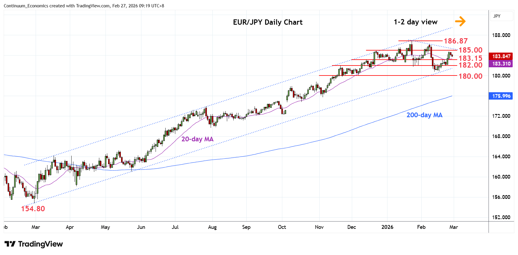 01:20 GMT - Lower in range from the 184.77 mid-week high as prices unwind overbought intraday studies. Daily studies are stretched as well and suggest strong resistance at the 184.92/185.00 area expected to cap and keep gains in check. Return below the 184.00 level will open up room for retest of support at the 183.15/00 area and where break will return open up room for deeper pullback to the 182.00 level. Would take break of the here to return focus to the 180.80 low and see room for deeper pullback to retrace rally from the February 2025 year low.