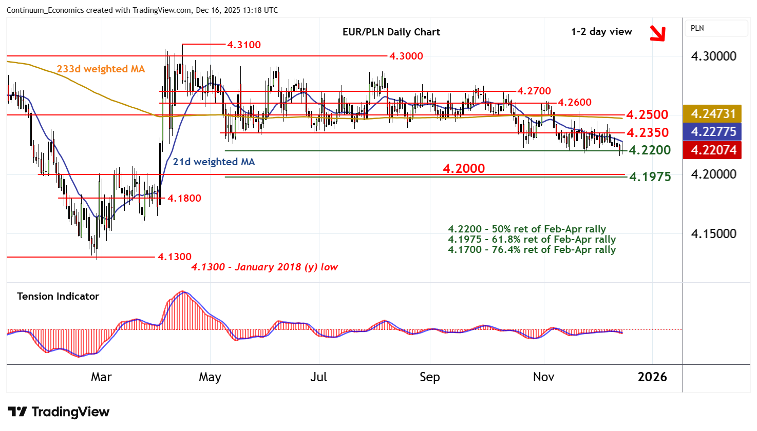 Chart EUR/PLN Update: Extending pressure on critical support at the 4.2200 Fibonacci retracement