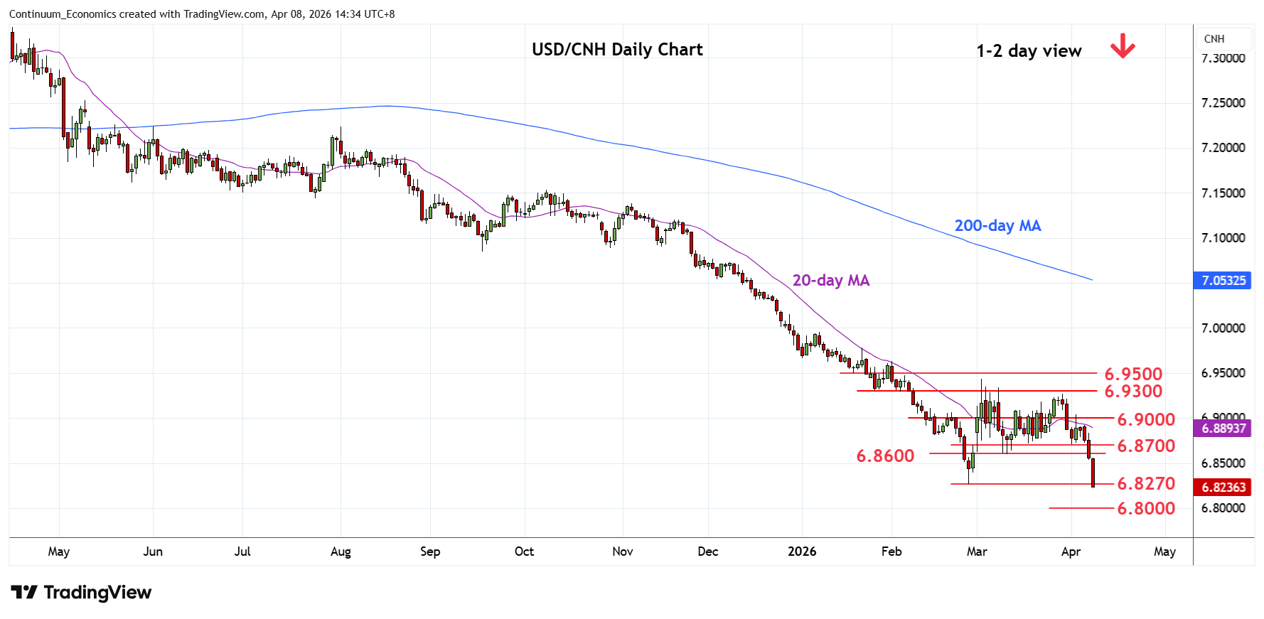 06:45 GMT - Break of the 6.8700/6.8600 support has seen follow-through to break 6.8270 low of February and extend losses from the April 2025 year high. Negative daily and weekly studies see room to the 6.8100 support and 6.8000 figure where reaction can be expected. A later break here will see further slide to 6.7740 support then the 6.7500 congestion. Meanwhile, resistance is lowered to the 6.8600/6.8700, March and 1st April low, which is expected to cap corrective bounce and sustain losses from the recent March highs corrective high at 6.9270/6.9340.