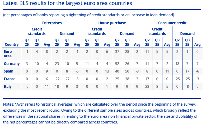 The (latest) October 2025 Bank Lending Survey (BLS), saw EZ banks report a small unexpected net tightening of credit standards for loans or credit lines to firms in the last quarter. Perceived risks to the industry or firm-specific situation and perceived risks to the economic outlook contributed to tighter credit standards, with the current high level of geopolitical uncertainty and risks connected to trade cited as reasons for discriminating across sectors or firms when issuing new loans. Several banks indicated more intensive monitoring and analysis. Across the four largest euro area countries, it was banks in Germany which reported the most overt a tightening of credit standards while banks in France, Italy and Spain reported unchanged credit standards. The net tightening was unexpected as, in the previous round, banks had anticipated that credit standards would be unchanged and it follows broadly unchanged credit standards in the second quarter.