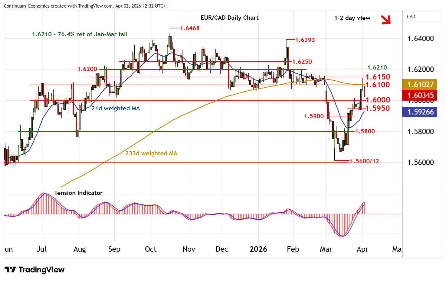 12:05 BST - The test above resistance at the 1.6100 break level has been pushed back from congestion around 1.6150 in steady selling pressure, as overbought intraday studies unwind, with prices currently trading around 1.6030. Overbought daily stochastics are leaning lower, highlighting room for a test of congestion support at 1.6000. But the positive daily Tension Indicator and rising weekly charts should limit any break in renewed buying interest above 1.5950. A close beneath here, however, will add weight to sentiment and prompt a deeper pullback. Meanwhile, resistance remains at 1.6100 and extends to 1.6150. This range should cap any immediate tests higher.