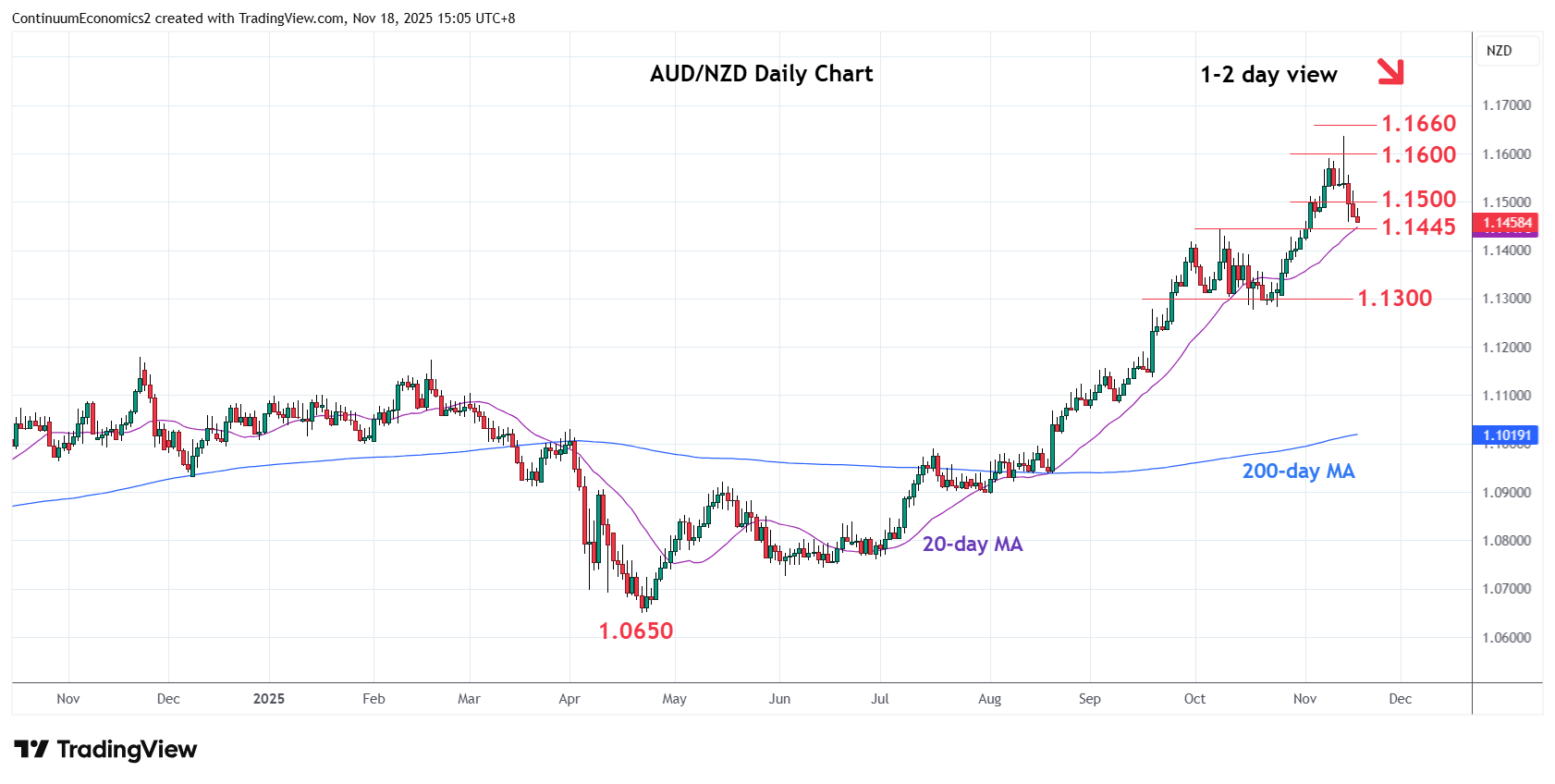 07:10 GMT - Extending rejection from the 1.1636 current year high as daily and weekly studies unwind overbought readings. Break of support at the 1.1500 congestion see room for deeper pullback to retrace the April/October rally to the 1.1445/00, October high and congestion area. Lower still, will open up room for extension to 1.1350/1.1300 congestion then the 1.1275, October low. Meanwhile, resistance is lowered to the 1.1500 level which is expected to cap and sustain pullback from the 1.1636 high.