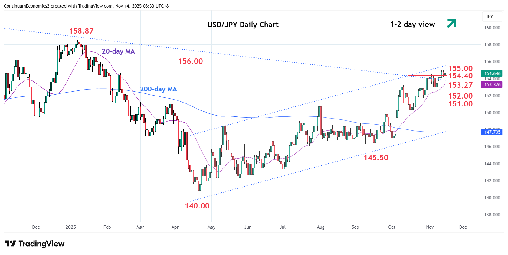 00:35 GMT - Settled into consolidation from test of the 155.00 level but further gains cannot be ruled out. Gains beyond this, if seen, will open up room for extension to 155.50 channel resistance and the 156.00 level. However, deep overbought daily and weekly studies caution corrective pullback with support starting at the 154.40/00 area. Break here will ease the upside pressure and open up room for pullback to retrace strong gains from the 145.50, September low. Lower will see scope towards strong support at 153.27/153.00, 10 October high and congestion area.
