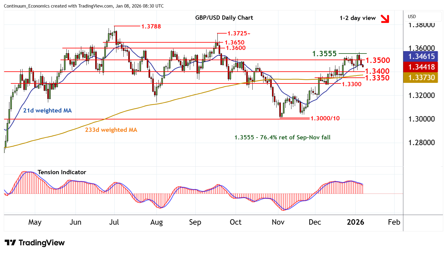 08:10 GMT - Cautious trade around 1.3500 is giving way to the anticipated drift lower, with steady selling interest currently trading around 1.3440. Negative intraday studies and deteriorating daily readings highlight room for a test of congestion support at 1.3400. But rising weekly charts are expected to limit any initial break in consolidation above 1.3350. Meanwhile, resistance remains at congestion around 1.3500 and should cap any immediate tests higher. However, a close above the 1.3555 Fibonacci retracement would turn sentiment positive and extend November gains initially towards congestion around 1.3600.