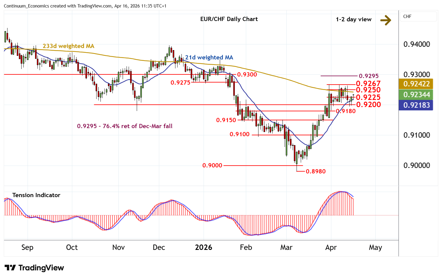 10:55 BST - Cautious trade following the test of support at 0.9200 is giving way to a push higher, as oversold daily stochastics tick higher, with prices currently trading around 0.9235. Focus is on resistance at congestion around 0.9250. But the negative daily Tension Indicator and flattening overbought weekly stochastics should limit any immediate break in consolidation beneath strong resistance at the 0.9267 monthly high of 31 March. Meanwhile, support is raised to 0.9225. But a close below 0.9200 is needed to turn sentiment negative and extend late-March losses towards support at 0.9150.