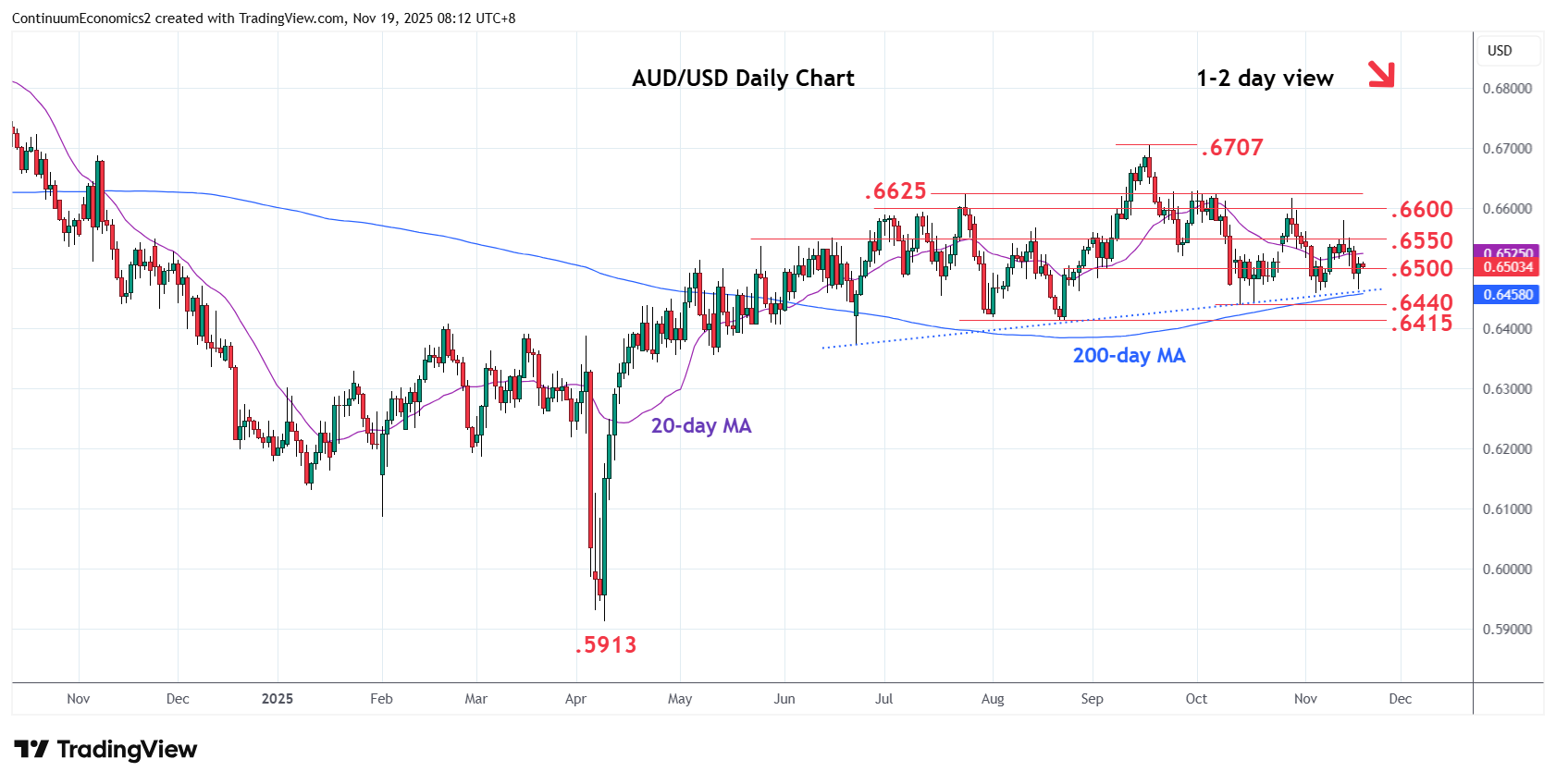 Back to consolidate at the .6500 level following bounce from the .6465 low