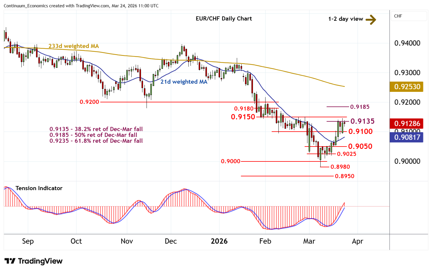 10:40 GMT - Little change, as flat overbought daily stochastics keep near-term sentiment cautious and prompt choppy trade beneath resistance at the 0.9135 Fibonacci retracement. The daily Tension Indicator is rising and broader weekly charts are also positive, highlighting room for later gains. A close above 0.9135 will improve sentiment and extend March gains beyond 0.9150 towards 0.9180/85. Overbought daily stochastics could prompt renewed profit-taking/consolidation towards here. Meanwhile, support remains at 0.9100. A close beneath here, if seen, should be limited to renewed buying interest/consolidation above the 0.9050 break level.