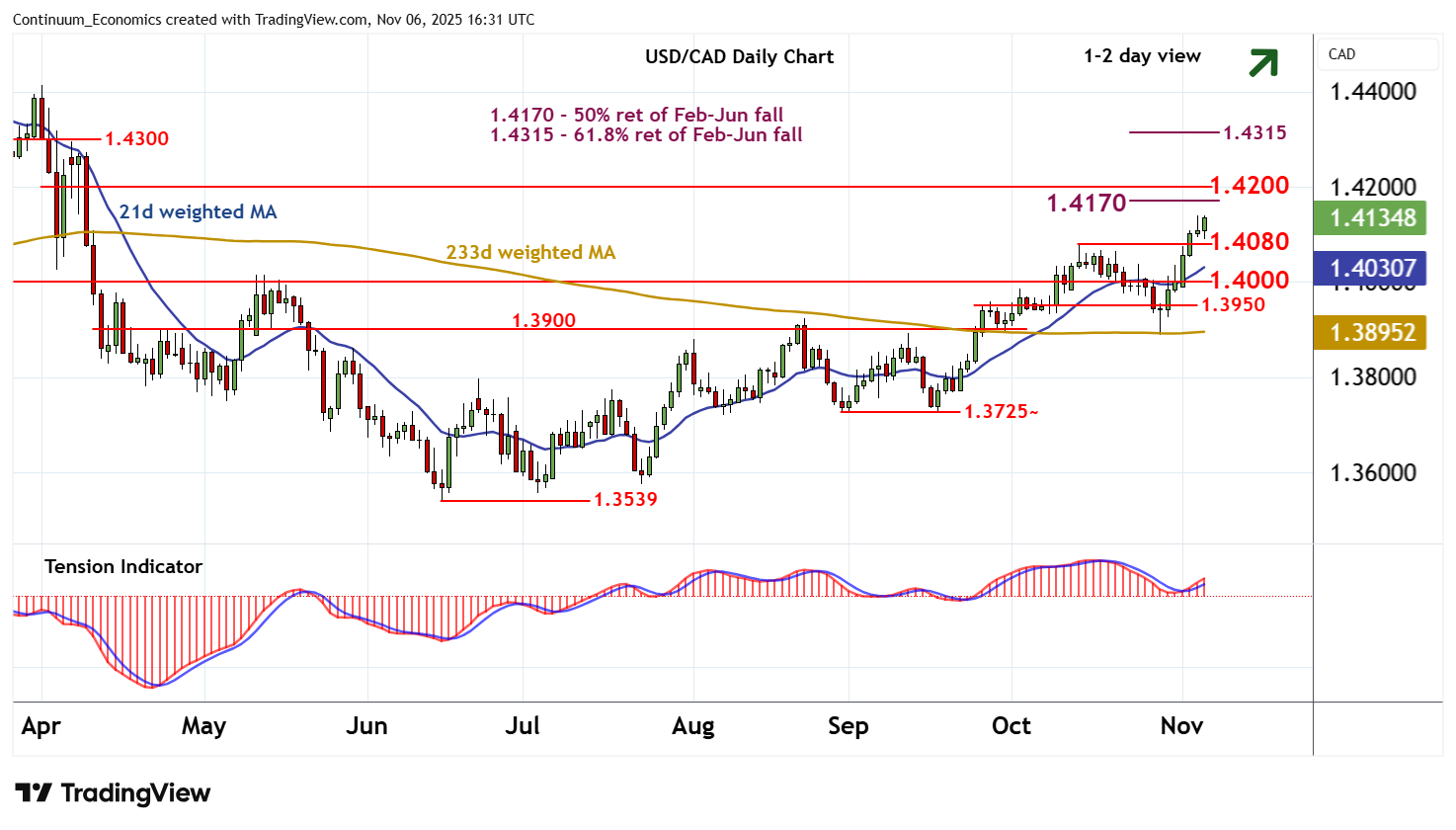 16:25 GMT - The anticipated minor pullback has bounced sharply from 1.4100 in CAD-driven trade, with prices once again trading around 1.4140. Oversold intraday studies are unwinding and daily readings are improving, suggesting room for continuation of June gains towards strong resistance at the 1.4170 Fibonacci retracement and congestion around 1.4200. However, already overbought weekly stochastics are expected to limit any initial tests in consolidation. Meanwhile, support remains down to the 1.4080 weekly high of 14 October. A close beneath here, if seen, will turn sentiment neutral and prompt consolidation above 1.4000.
