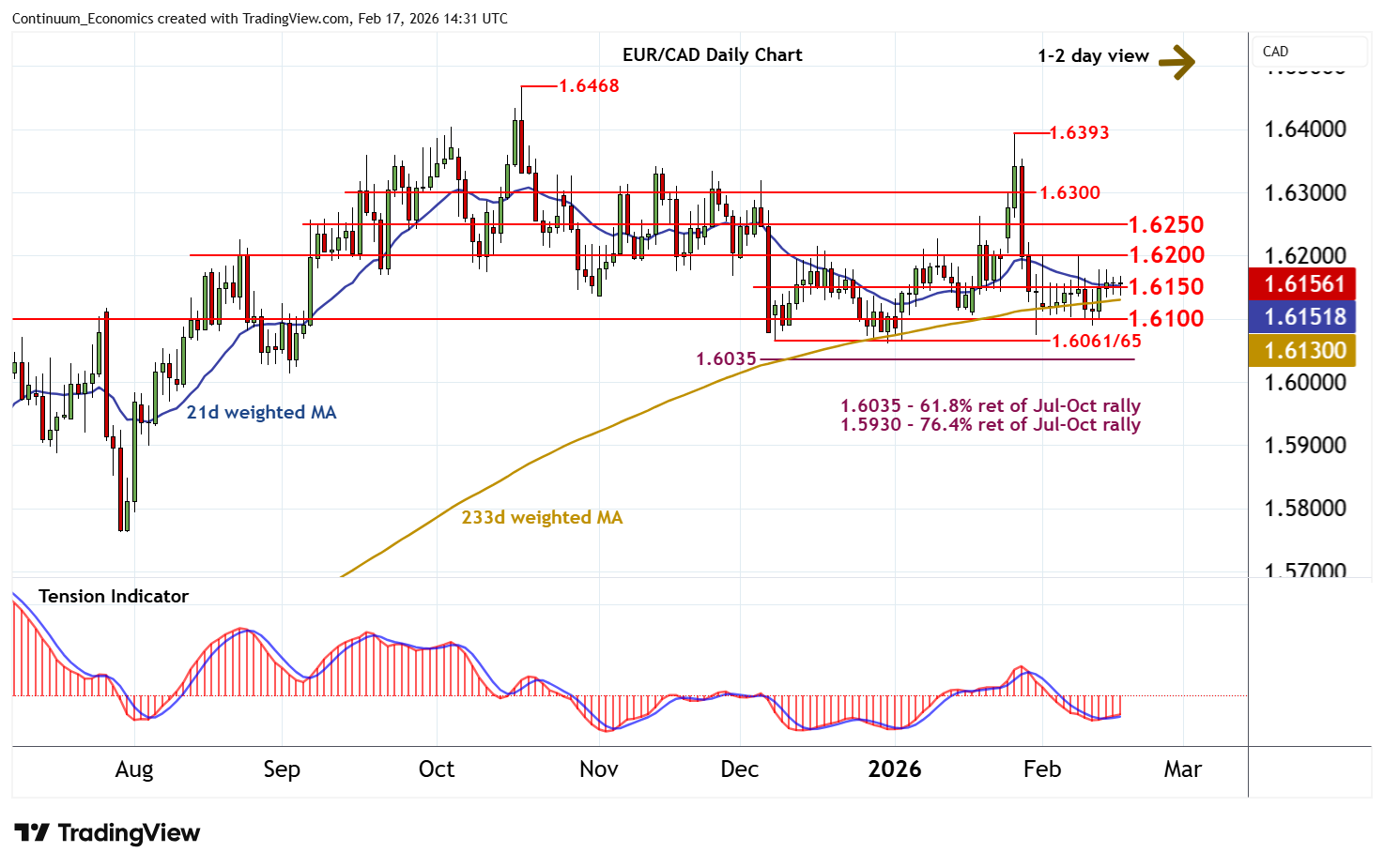14:10 GMT - Still little change, as prices extend cautious trade above congestion around 1.6150. Intraday studies have ticked higher and daily readings continue to rise, highlighting potential for a test of congestion resistance at 1.6200. However, broader weekly charts are mixed/negative, suggesting any further gains are expected to meet renewed selling interest towards 1.6250. Meanwhile, any immediate tests below congestion support at 1.6150 should give way to fresh consolidation above further congestion around 1.6100.
