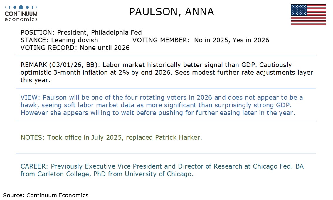 Weekend comments from Fed's Paulson, a voter in 2026, lean dovish, but she is not in a hurry to ease further.