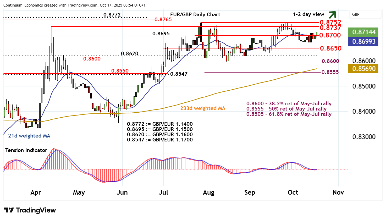 08:45 BST - Choppy trade around 0.8680 has given way to a sharp run higher, with prices extending the break above 0.8695/00 to currently trade around 0.8615. Daily stochastics are rising and the flat daily Tension Indicator is showing early signs of improvement, suggesting room for a test of critical resistance at the 0.8752 current year high of 28 July and the 0.8765 high of November 2023. However, negative weekly charts should limit any initial tests in consolidation. A close above here, if seen, would turn sentiment positive and extend December 2024 gains beyond 0.8772, (GBP/EUR 1.1400). Meanwhile, any tests below 0.8695/00 should be limited in consolidation above congestion support at 0.8650.