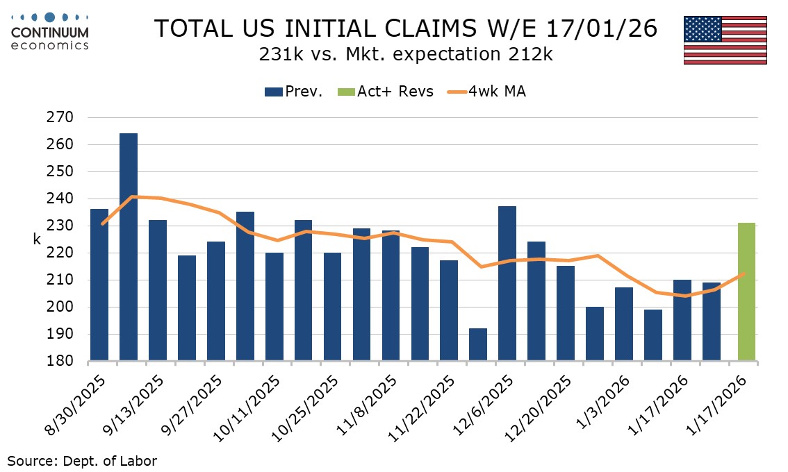 While initial claims, despite the latest rise, still present a healthy picture, that contrasts a sharp rise in January layoffs data from Challenger, Gray and Christmas, with the total number of layoffs at 108,435 being up from 49,795 in January 2025 and the highest for a January since the financial crisis in January 2029. Transport, technology and health care led the increase. Layoff announcements are unlikely to be weather-related,