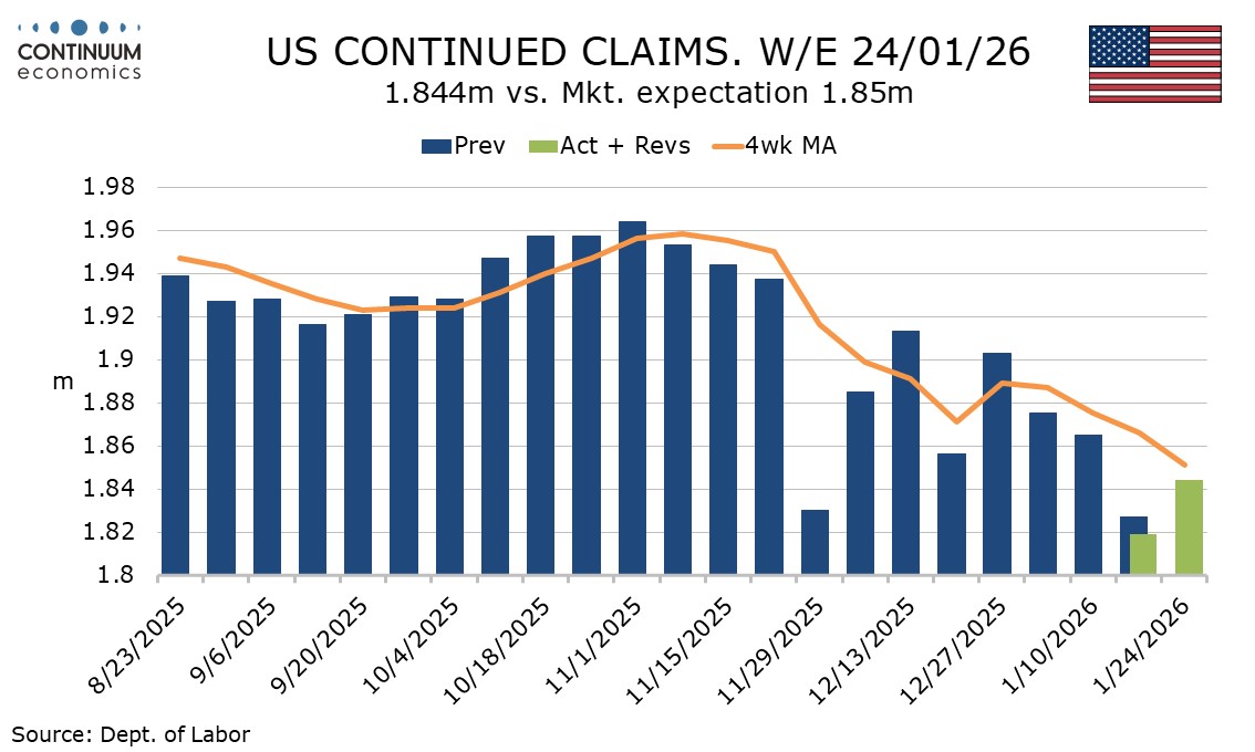 Continued claims cover the week before initial claims and increased to 1.844m from 1.819m, still lower than expected, with the preceding week revised down from 1.827m, reaching its lowest level since October 2024. The 4-week average is also the lowest since October 2024.