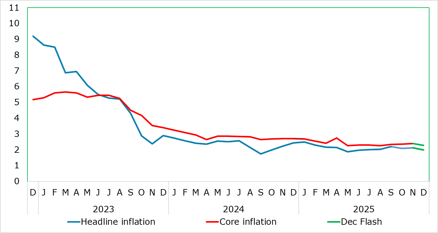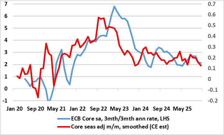 HICP inflation has been range bound for the last 5-6 months between 2.0% and 2.2% with the November and October numbers in the middle of that range. And it stayed in that range falling to 2.0% in the December flash numbers, albeit where adverse rounding pre vented a fall to 1.9%. We see this as the start of a fresh but what may be a short-lived fall toward 1.5% in H1 2026. Some of this may be energy related but a 0.1 ppt correction back in services last month did the core down a notch to a new cycle low of 2.3%. However, this also reflected a further fall in non-energy industrial goods (NEIG) inflation, this possibly an increasing sign of softer import prices possibly related to Chinese export dumping. While this may temper hawkish thinking, the December data very much chime with the ECB’s latest projection.