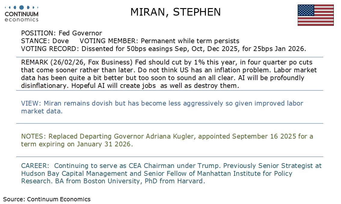 Fed's Miran continues to argue a dovish case though less aggressively so given reduced labor market risks.