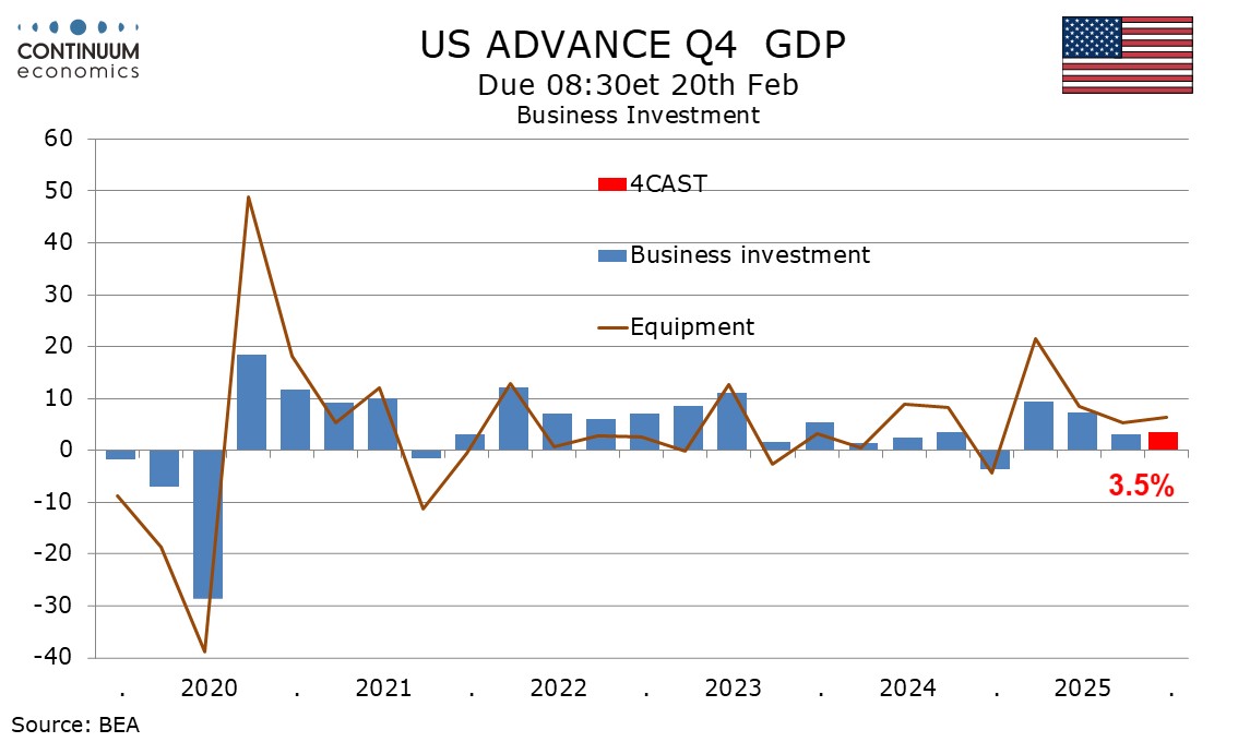 We expect business investment to rise by 3.5%, similar to Q3’s 3.2%, again with positives from equipment and intellectual property and a negative from structures. There are mixed signals with durable goods data stronger than industrial production.