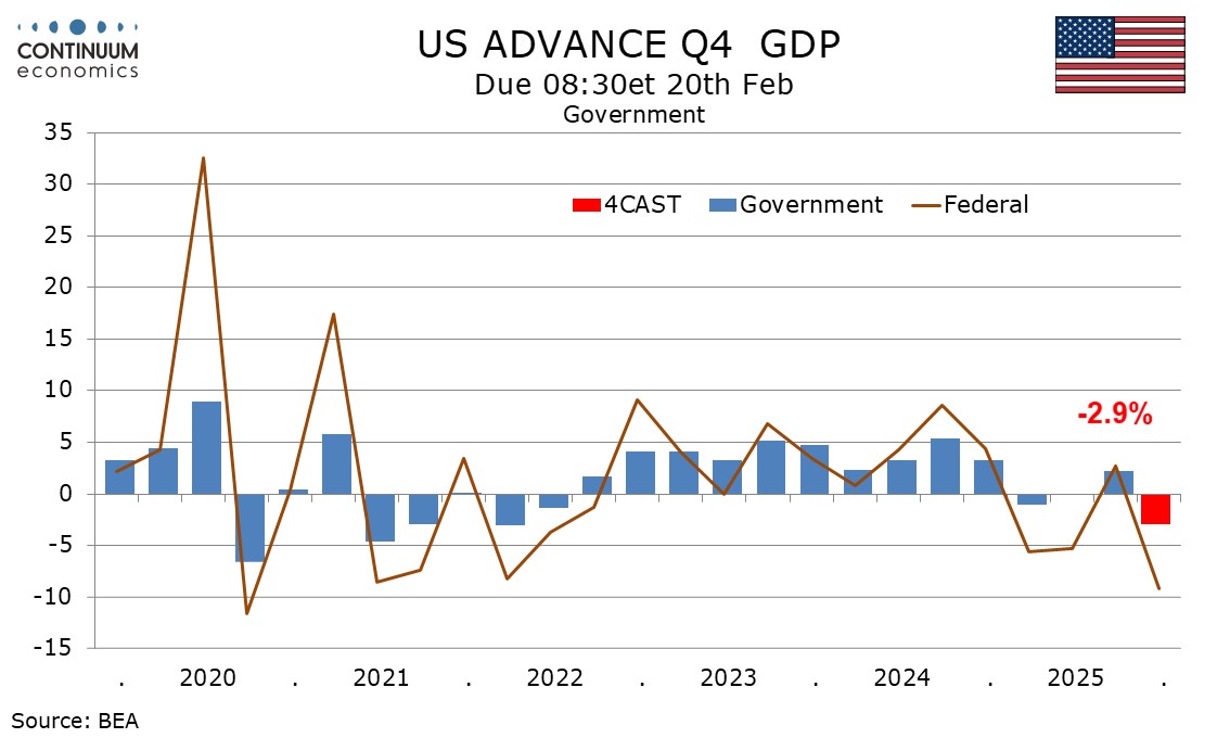 With the Federal government having shut down in October and early November, we expect a weak quarter from government at -2.9%. The decline will be due from Federal spending but we also expect State and Local at 1.2% to slow from 2.0% in Q3.